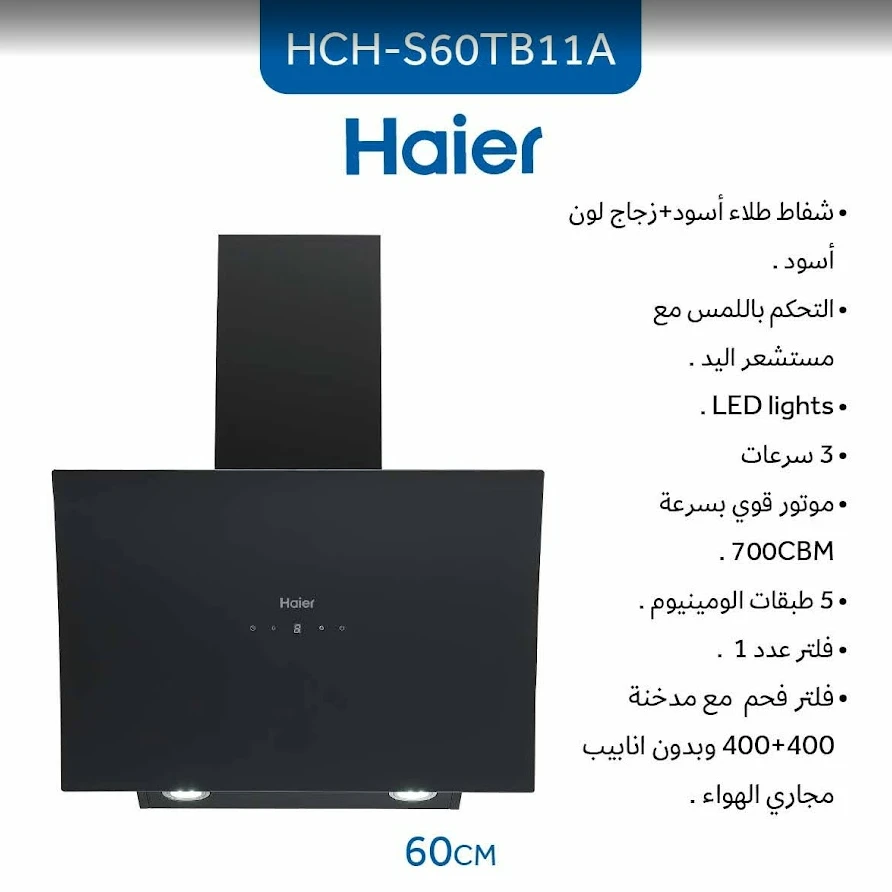 شفاط مطبخ Haier موديل HCH-S60TB11A يتميز بتصميم أنيق يجمع بين الزجاج الأسود اللامع والطلاء المتين، مما يمنح مطبخك لمسة عصرية وفاخرة.