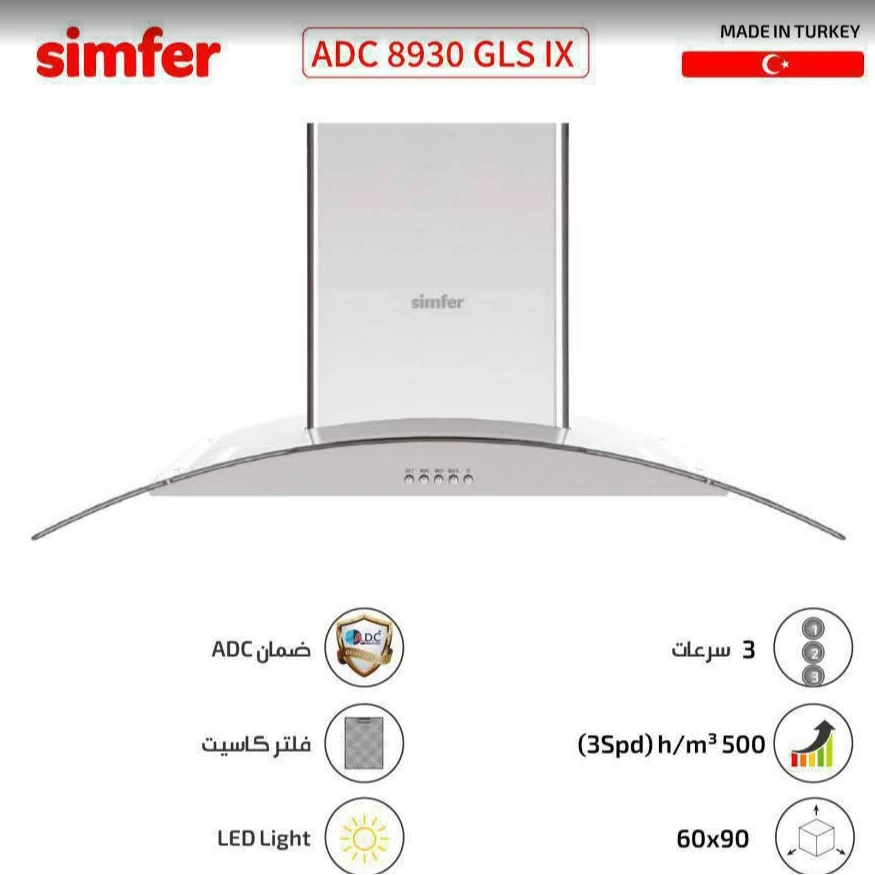 شفاط سيمفير مع مدخنة 90 سم زجاج / SMF-ADC8930GLS-IX