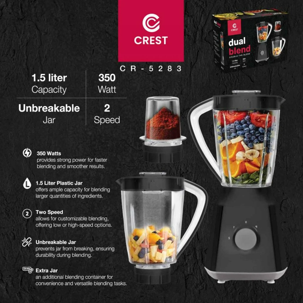استمتع بتجربة خلط قوية وسلسة مع خلاط Crest CR-5283 المصمم لتلبية احتياجات المطبخ اليومية بسهولة وكفاءة. يتميز بمحرك بقوة 350 واط يمنحك أداءً ممتازًا في تحضير العصائر، السموذي، الصلصات، وحتى طحن المكونات الجافة بفضل المطحنة الإضافية المرفقة.