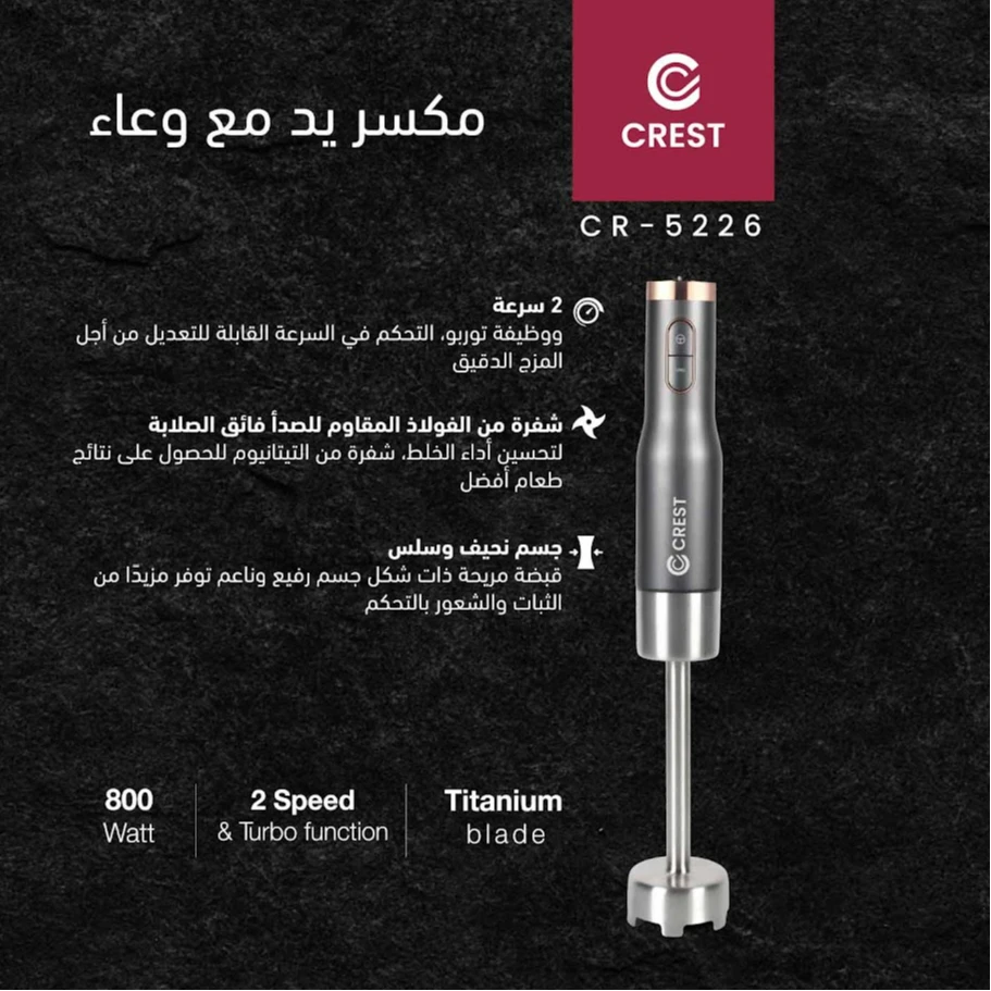 يأتي خلاط كريست اليدوي CR-5226 بتصميم عصري يجمع بين القوة والأناقة، ليمنحك أداءً عالي الكفاءة في كل استخدام. يتميز بمحرك قوي بقدرة 800 واط لتسهيل عملية الخلط والعجن والطحن بسرعة وسلاسة، مع شفرة مصنوعة من التيتانيوم المقاوم للصدأ للحصول على نتائج دقيقة وطعام متجانس. تصميمه النحيف والمريح يجعله مثاليًا للاستخدام اليومي.