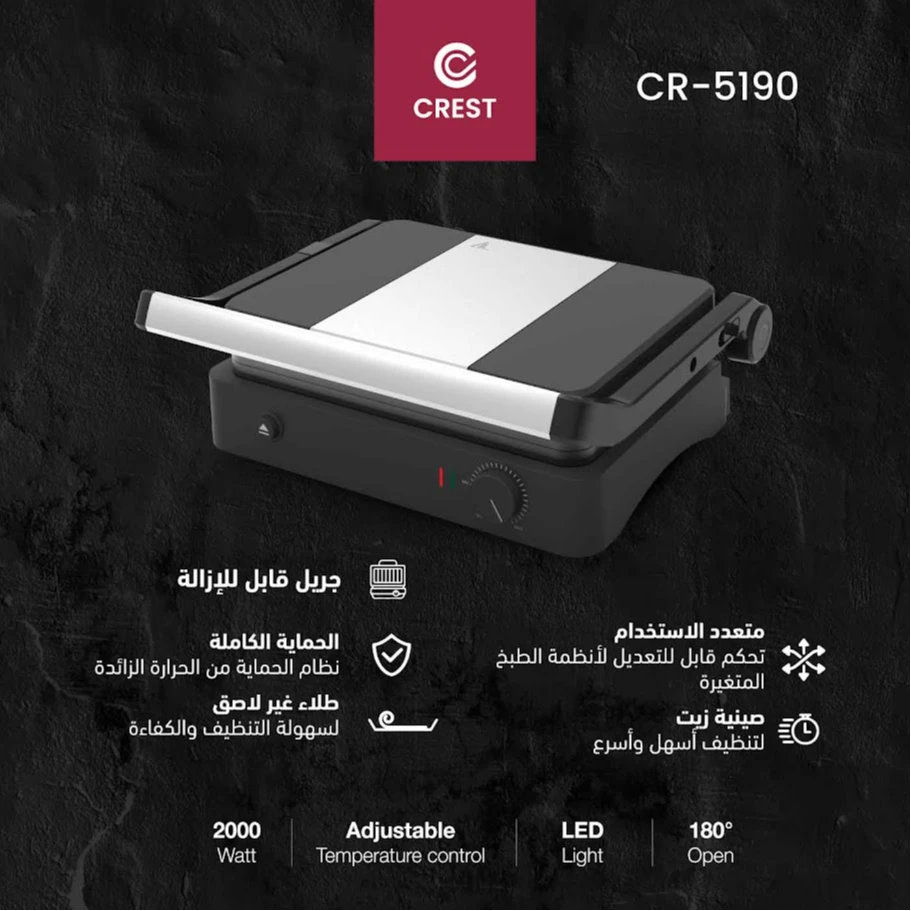 تمتع بتجربة شواء مثالية مع كريست CR-5190 التي تجمع بين القوة، الأمان، وسهولة التنظيف. بفضل قدرتها العالية 2000 واط والتحكم القابل للتعديل في درجة الحرارة، يمكنك طهي أنواع مختلفة من الأطعمة بسرعة وكفاءة.