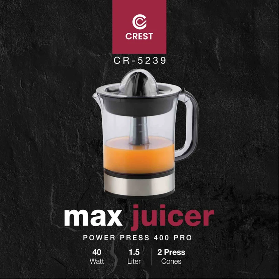 استمتع بعصير طازج ولذيذ كل يوم مع عصارة كريست ماكس CR-5239 – باور بريس 400 برو، المصممة لتمنحك أداءً عالي الكفاءة وسهولة في الاستخدام، لاستخلاص العصير من مختلف أنواع الحمضيات بكل راحة وسرعة.